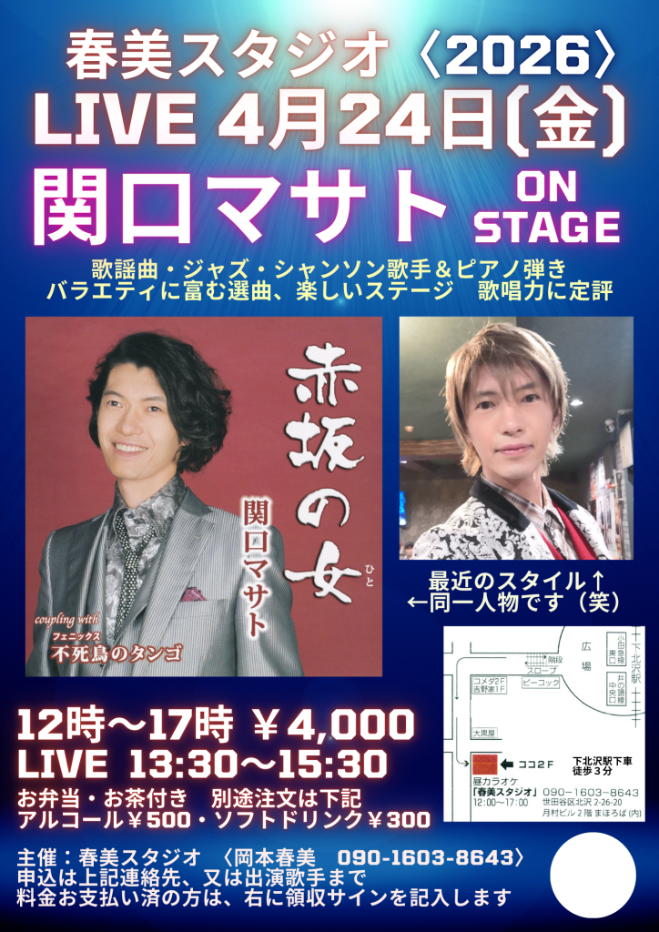 [備 考]:関口マサトまで、ご連絡頂ければ対応いたします (お支払いは当日です)
